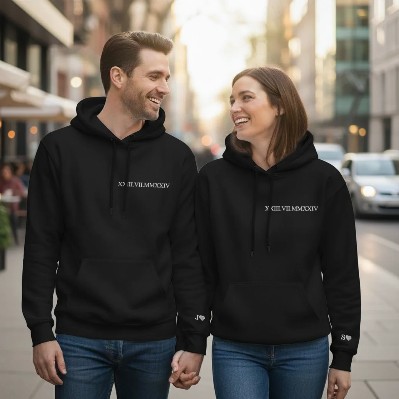 Personalisierte Partner-Hoodies mit besticktem Datum & Initialen. Ein emotionales Geschenk für Paare.